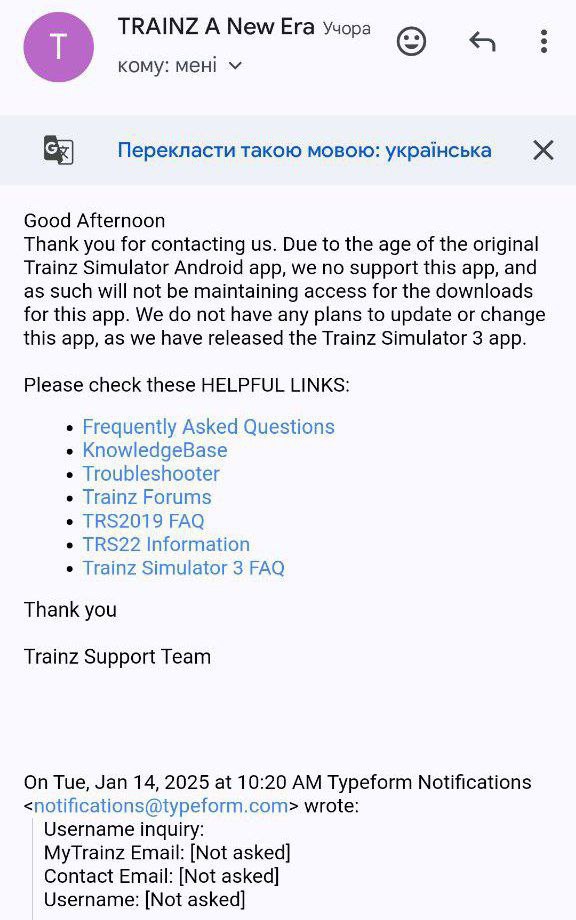 Перевод: "Спасибо, что связались с нами. Из-за возраста оригинального приложения Trainz Simulator для Android мы не поддерживаем это приложение и, как следствие, не будем поддерживать доступ к загрузкам этого приложения. У нас нет планов обновлять или изменять это приложение, поскольку мы выпустили приложение Trainz Simulator 3."